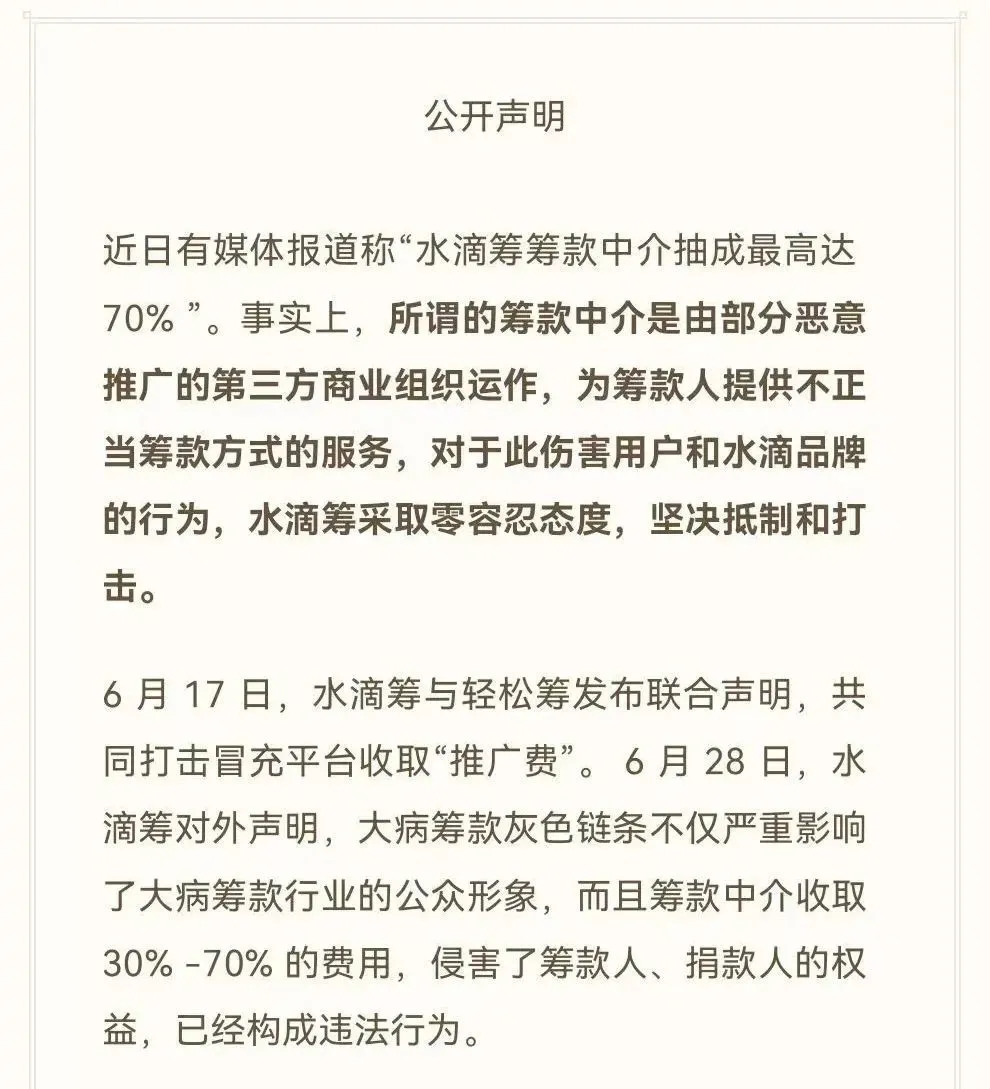 很快,水滴筹微博发布声明回应“水滴筹筹款中介抽成更高达70%”。声明称,所谓的筹款中介是由部分恶意推广的第三方商业组织运作,为筹款人提供不正当筹款方式的服务,对于此伤害用户和水滴品牌的行为,水滴筹采取零容忍态度,坚决抵制和打击。